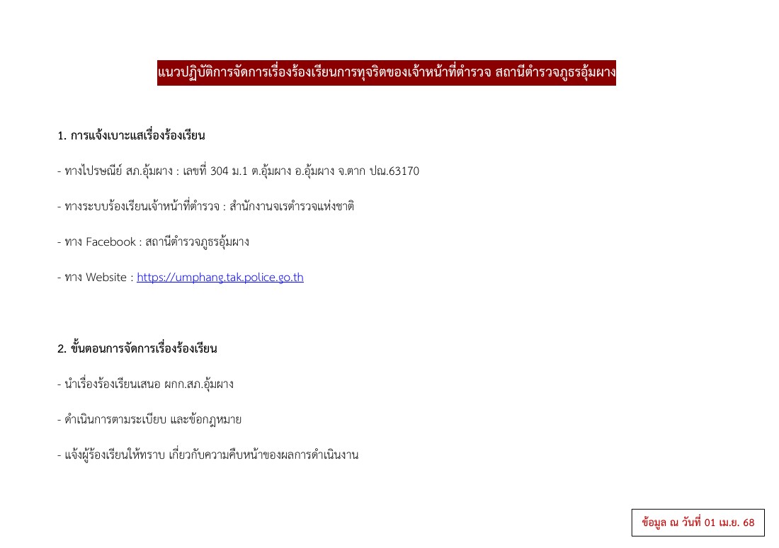 1. ช่องทางการแจ้งเรื่องร้องเรียนการทุจริต ของเจ้าหน้าที่ตำรวจ สภ.อุ้มผาง
