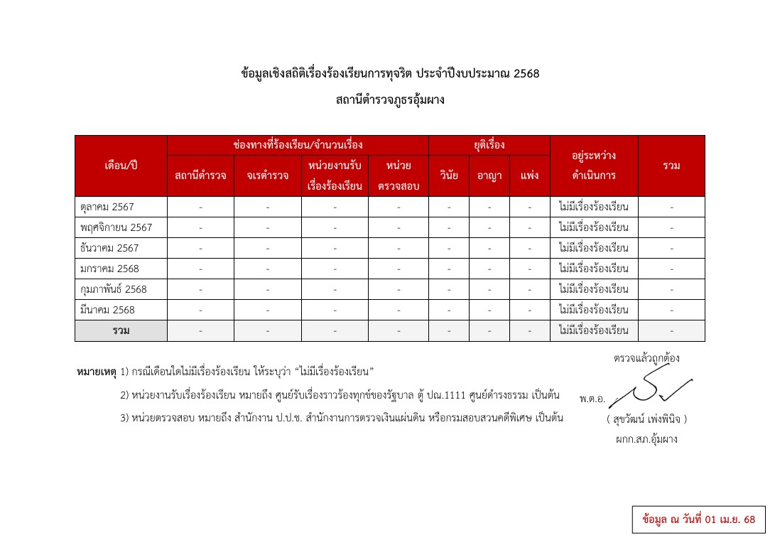 3. ข้อมูลเชิงสถิติเรื่องร้องเรียนการทุจริต ของเจ้าหน้าที่ตำรวจ สภ.อุ้มผาง
